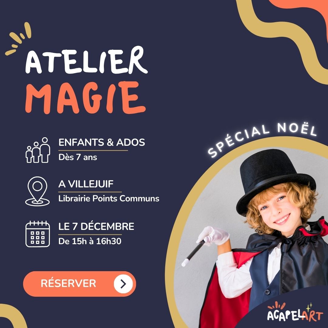 Les enfants découvrent des tours étonnants et faciles à reproduire, réalisés avec des objets du quotidien et inspirés de l’univers des fêtes (rubans, lumières, cartes, cadeaux…). Ils repartent avec leurs “secrets” et des étoiles plein les yeux ? ?? Dimanche 7 décembre 2025 · 15h00–16h30 ? Dès 7 ans ?? Café-librairie Points Communs, Villejuif ?? Encadrement par un magicien pédagogue, ambiance bienveillante ?? Objectifs : Découvrir la magie de manière ludique et participative Développer coordination, concentration et confiance en soi Stimuler la créativité et l’expression scénique ?? Contenu (version Noël) : Le magicien propose des tours adaptés à l’univers de Noël : illusions avec lumières, rubans colorés, objets scintillants et petits paquets “magiques”. Les enfants participent activement à la mise en scène et apprennent à présenter leurs tours comme de vrais artistes.