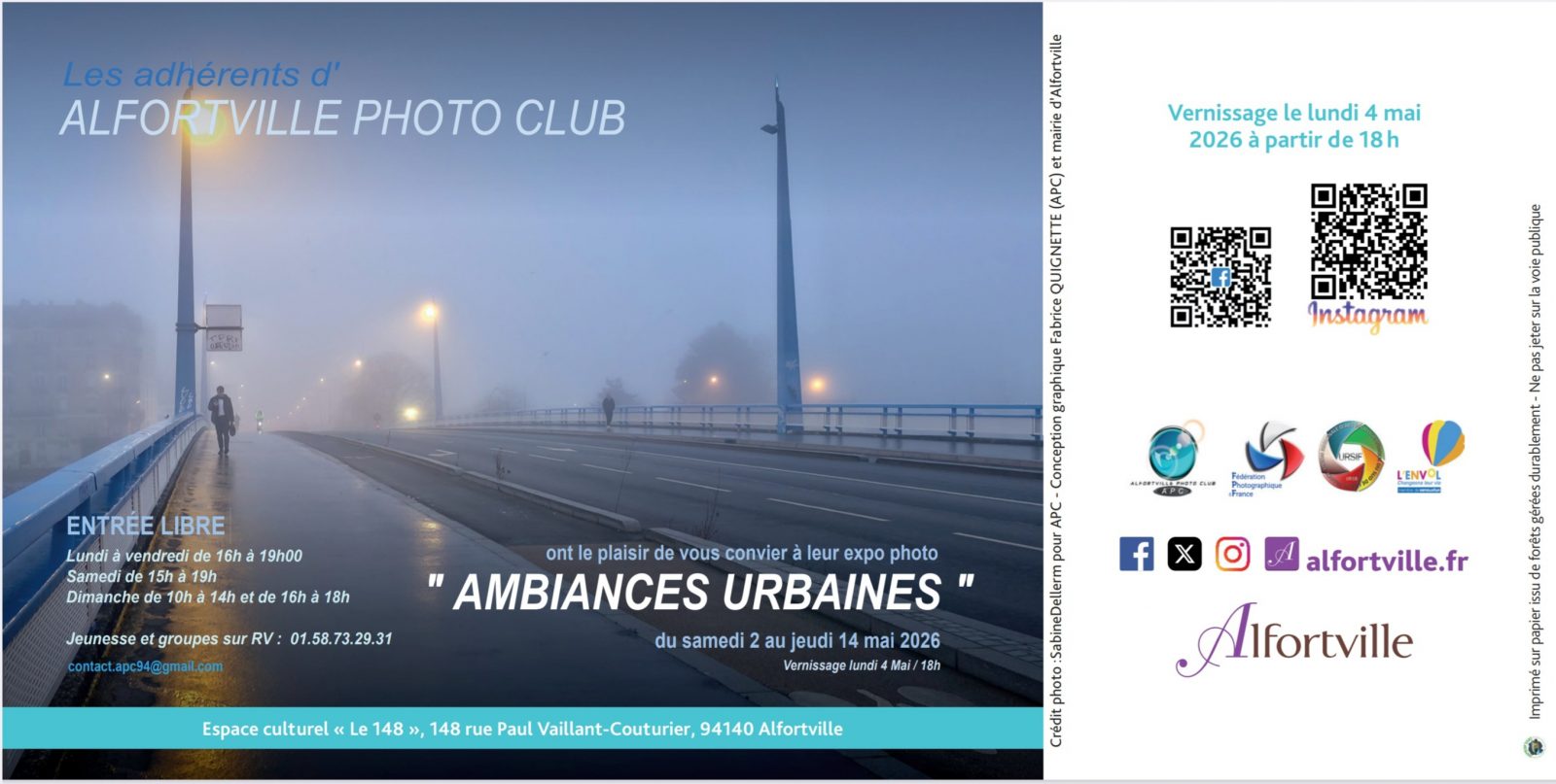 Les adhérent(e)s du Photo Club d'Alfortville, également affiliés à la Fédération Photographique de France, vous invitent, ainsi que leur Président Fabrice QUIGNETTE, à découvrir leur réflexion autour du thème Ambiances Urbaines, à l'Espace Culturel 148 (entrée libre) sous le Haut Patronage de leur Président d'Honneur, Monsieur Carvounas, Maire d'Alfortville.