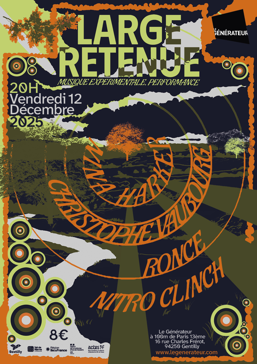Par le biais de la performance, la musique expérimentale s’amplifie, se tord et se mue. Large Retenue, comme un anagramme du Générateur, comme un paradoxe : la contrainte du geste et l’ampleur du lieu invitent à l’exploration sonore.