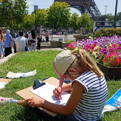 Installé sur la pelouse du Trocadéro, les enfants, accompagnés d'un adulte,  viennent exprimer leur créativité devant la plus grande dame de Paris, la Tour Eiffel.